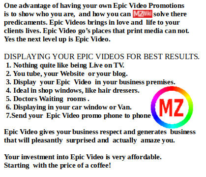 One advantage of having your own Epic Video Promotions is to show who you are, and how you can help others solve there predicaments. Epic Videos brings in love and life to your clients lives. Epic Video go’s places that print media can not.